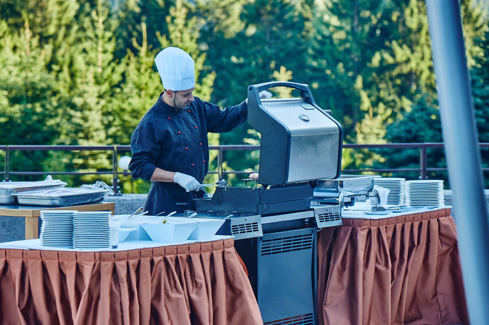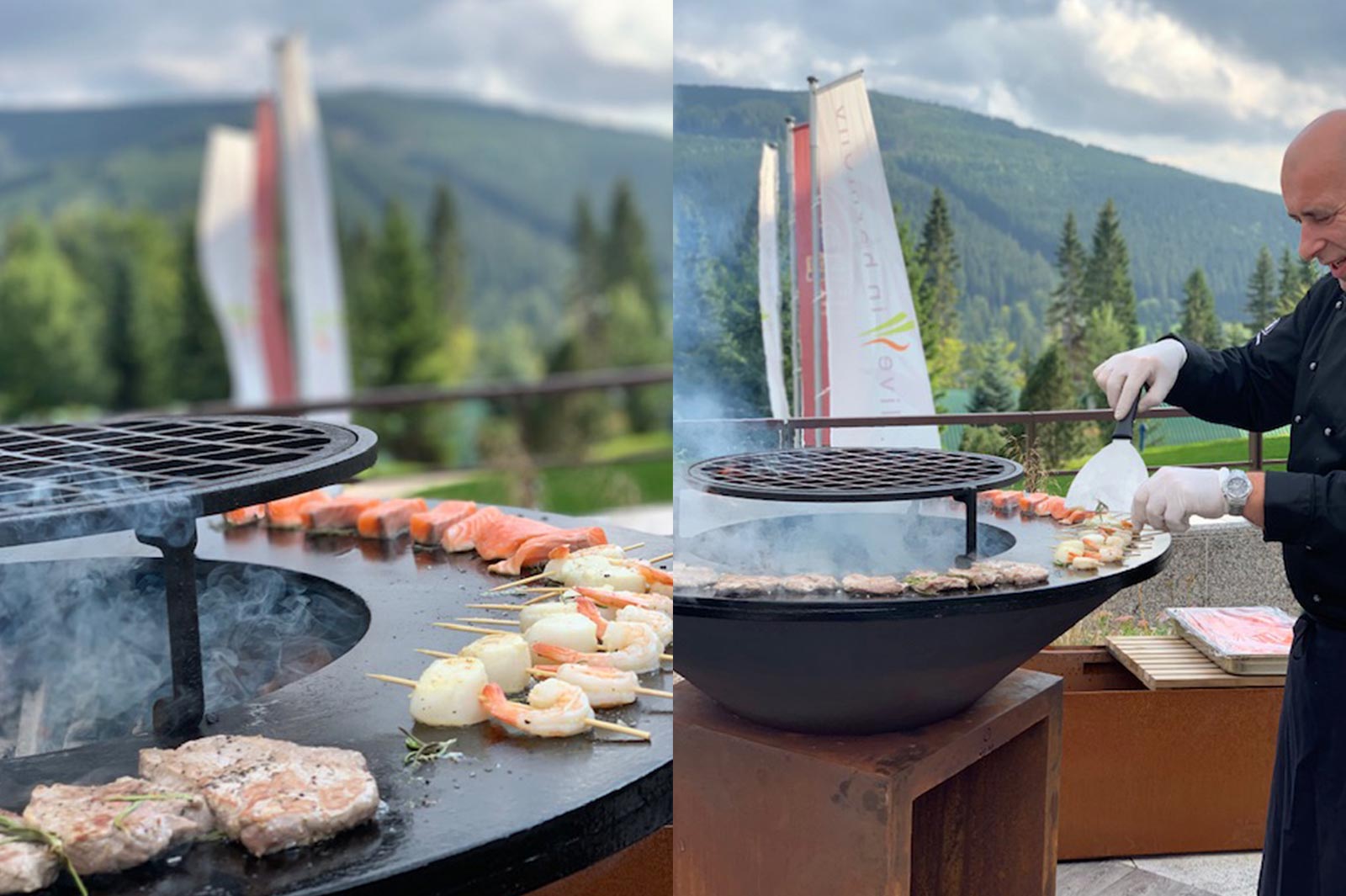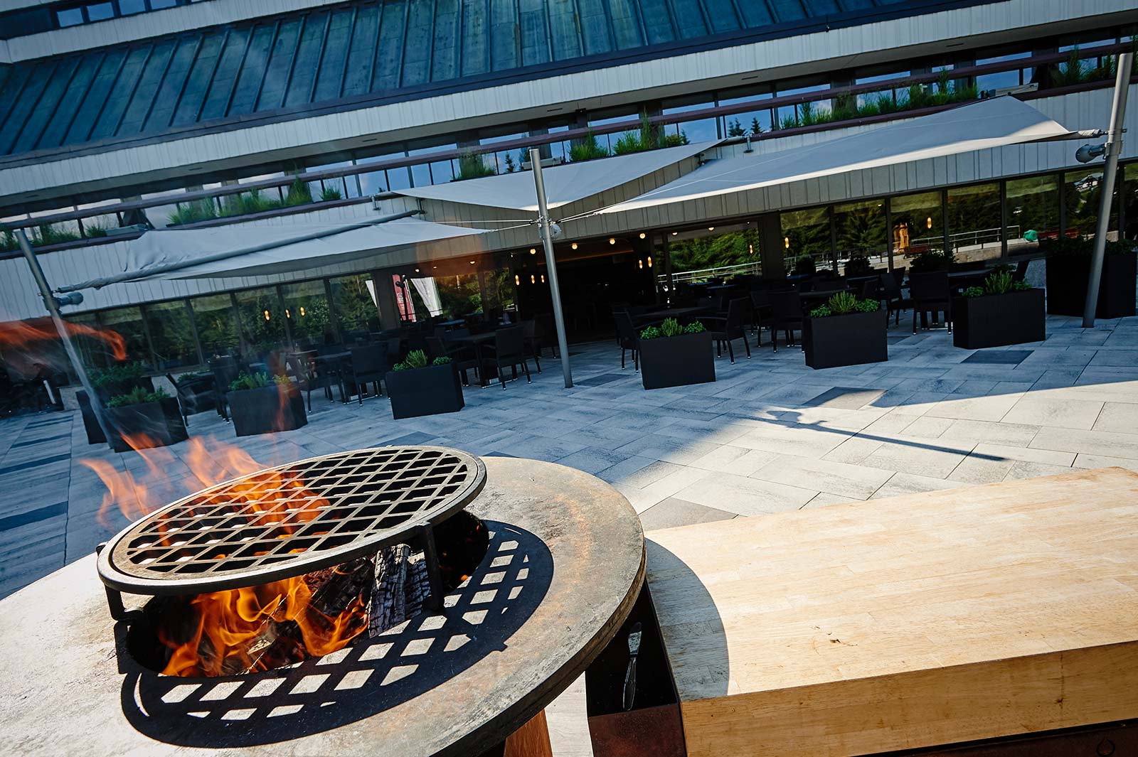 Nowoczesny grill OFYR jest częścią naszego tarasu w restauracji bufetowej Classico. W sezonie letnim regularnie grillujemy w ramach kolacji w formie bufetu. Na życzenie przygotowujemy na przykład powitalny bufet z grillem lub nawet atrakcyjne zimowe grille dla zamkniętej liczby osób.
