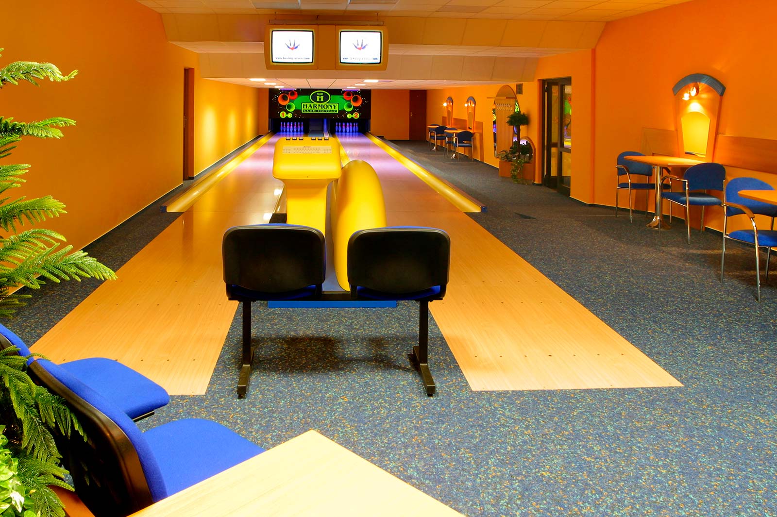 2 tory do gry w kręgle z barem - kręgielnia jest połączona spiralnymi schodami z symulatorem golfa.