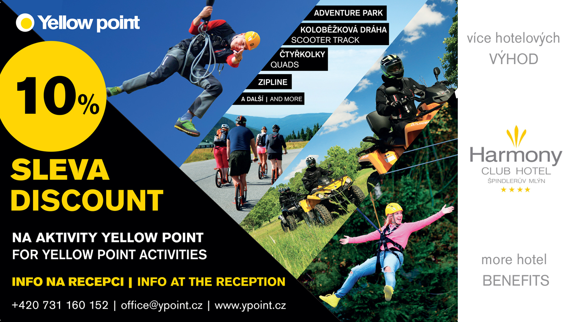 Miłośnicy golfa z pewnością docenią zniżkę w wysokości 50% opłaty za grę na polu golfowym, 40 km od hotelu Harmony Club - ośrodek golfowy Mlade Buky. Rezerwacja, płatność i więcej informacji w recepcji hotelu.